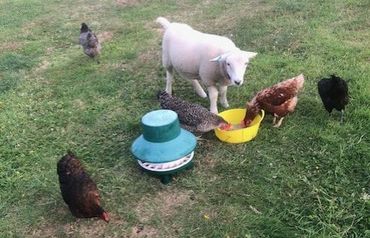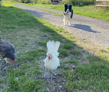All our eggs are supplied by our troupe of assorted chickens. We have about a dozen, and they are free to range all over the farm, so you might see them in the lane, on the fields or in one of the gardens.